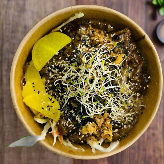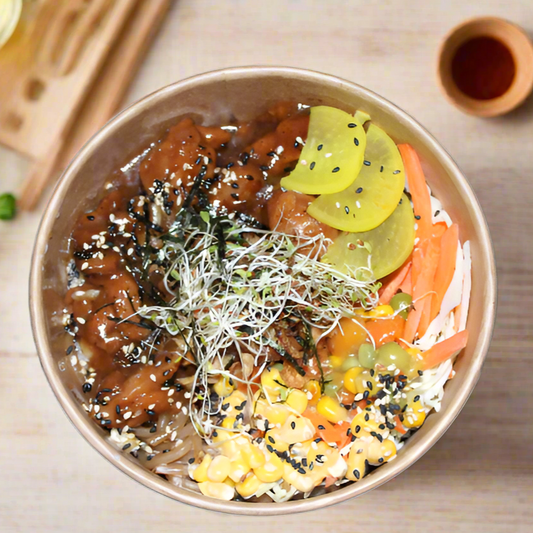 Welcome to Saint Boba's Korean BBQ Cupbop collection, where we bring the vibrant flavors of Korean street food to St. Thomas. Our Cupbop dishes feature a harmonious blend of marinated proteins—beef, chicken, pork, or tofu—served over a base of sticky rice and glass noodles, accompanied by fresh vegetables like chopped cabbage and carrots. Each bowl is finished with our signature sauces, offering a balance of sweet, savory, and spicy notes.